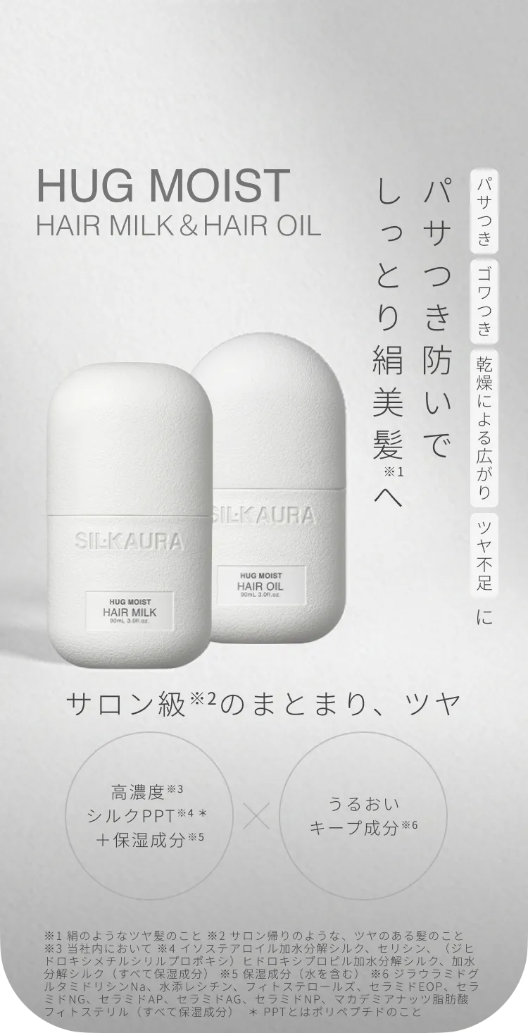 軽やかなツヤ質感のオイルでベタつきを解消。高保湿成分が髪になじみ、しっとりなめらかな指通りを叶えます。