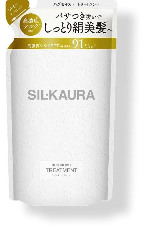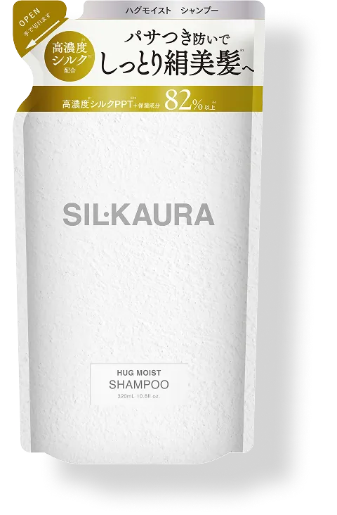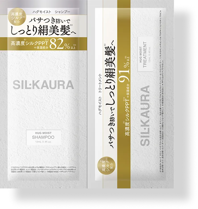 ※1 絹のようなツヤのこと ※2 当社内において ※3 ラウロイル加水分解シルクNa(補修成分)、ラウロイルシルクアミノ酸Na(洗浄成分)、イソステアロイル加水分解シルク(保湿成分)、セリシン(保湿成分)、(ジヒドロキシメチルシリルプロポキシ)ヒドロキシプロピル加水分解シルク(保湿成分)、加水分解シルク(保湿成分) ※4 保湿成分(水を含む) *PPTとはポリペプチドのこと