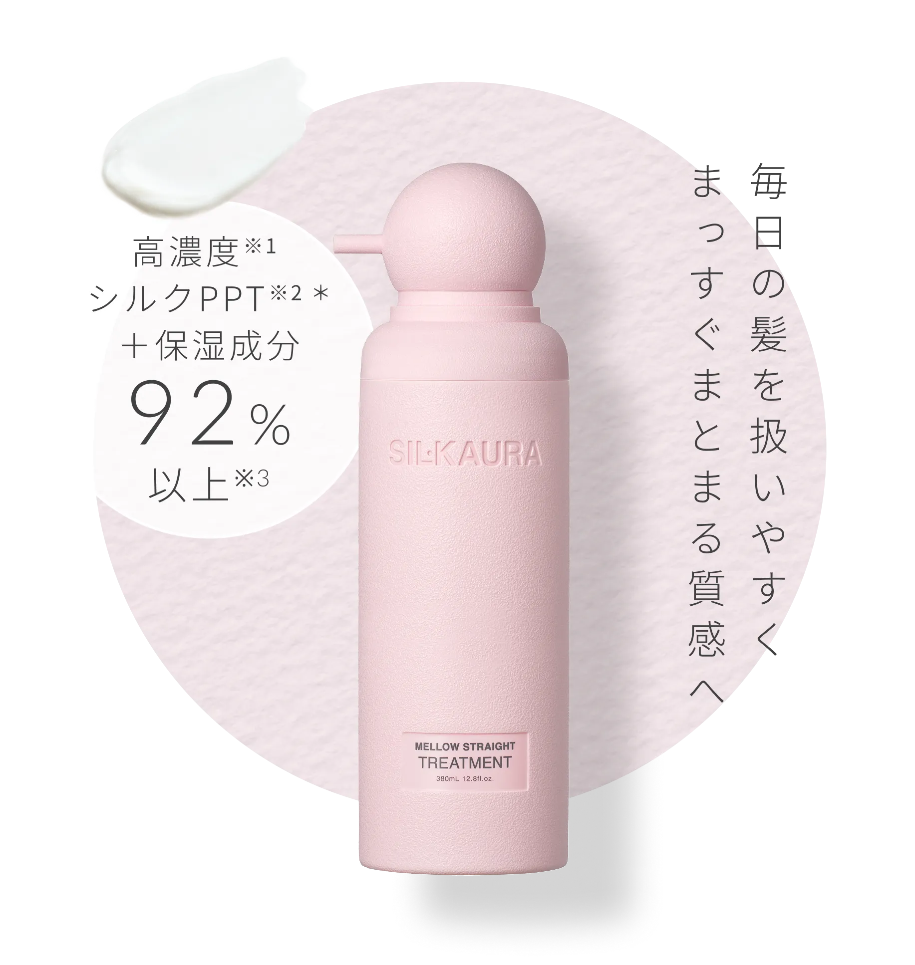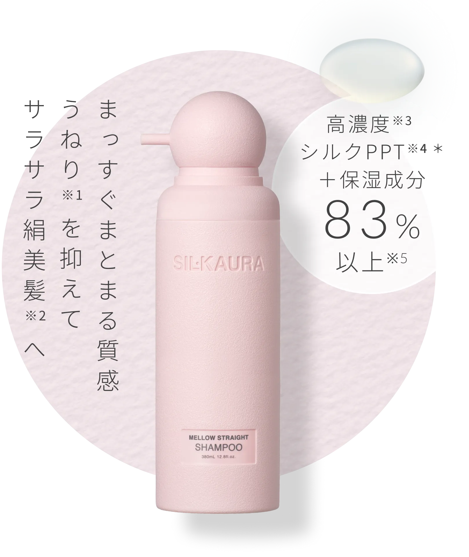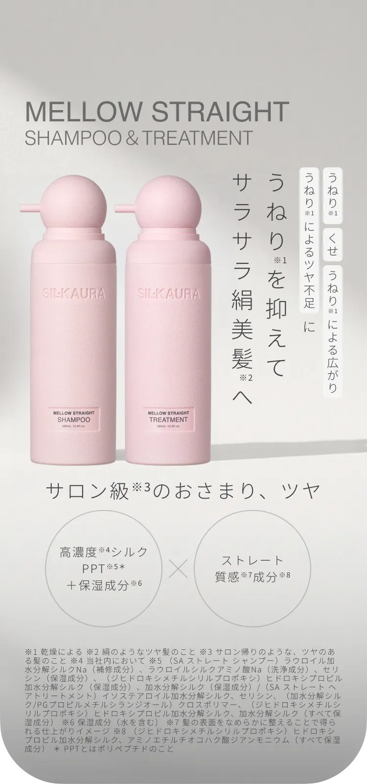 ※1 乾燥による ※2 絹のようなツヤ髪のこと ※3 当社内において ※4 (SA ストレート シャンプー)ラウロイル加水分解シルクNa(補修成分)、ラウロイルシルクアミノ酸Na(洗浄成分)、セリシン(保湿成分)、(ジヒドロキシメチルシリルプロポキシ)ヒドロキシプロピル加水分解シルク(保湿成分)、加水分解シルク(保湿成分) ※5 保湿成分(水を含む) * PPTとはポリペプチドのこと